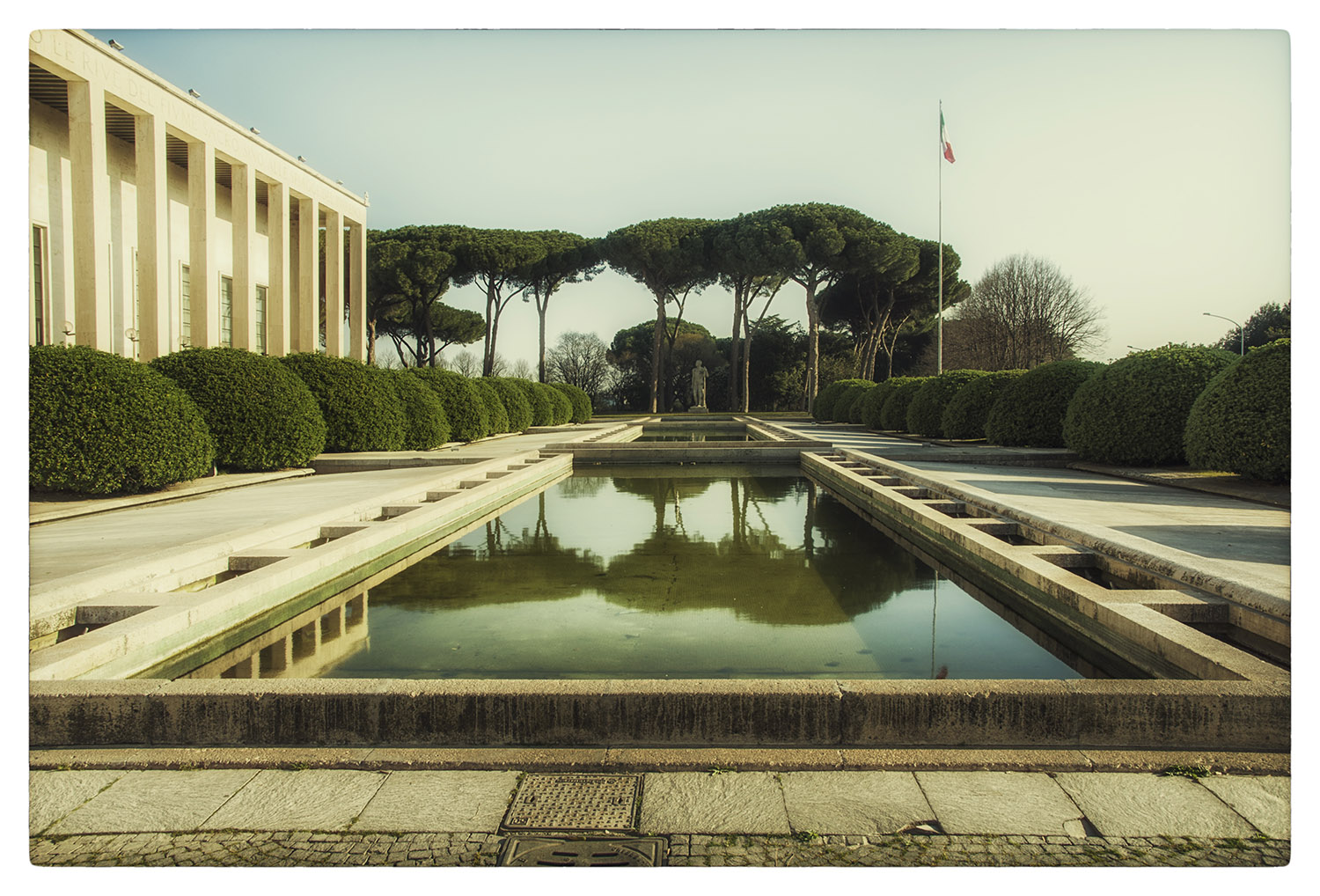 E' tutto estremamente rigoroso: il progetto architettonico, il verde, l' impostazione di ripresa che evidentemente mira a sottolineare questo rigore. Con queste premesse, vedere che le ultime colonne divergono e vedere che mancano gli estremi della vasca stride un po'.