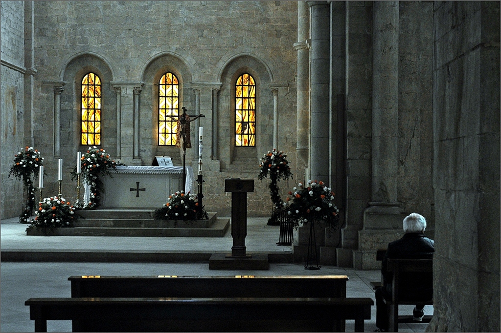 Concordo con Fabio sulla efficace disposizione della figura umana; poi c'è qualcosa di meraviglioso sui poggiagomiti dei banchi: il riflesso delle finestre; forte sul primo banco, più tenue sul secondo; è la luce, filtrata, coprotagonista della foto; ho visto spesso il ringraziamento, la preghiera nei tuoi scatti; in forme diverse, d'altra parte anche scattare una foto a un tramonto è una forma di preghiera, glorificazione (alla Natura, al Creatore , alla Bellezza che dir si voglia, è la stessa cosa) ; qui hai scelto una rappresentazione della preghiera raccolta, silenziosa, istituzionalizzata; il rapporto fra noi, lì, seduti da soli di fronte alla luce, e la luce, che entra e si riflette; soli con la luce, che è una delle condizioni con cui la vita può essere in noi; non posso che apprezzarti, sai fermarti a pensare, quando non pensare e vivere secondo gli stereotipi illusori è tanto più facile; per questo stellizzo. _________________ .. comunque, continuo a pensare che l' unica cosa che con certezza sappiamo della vita, è che non sappiamo cos'è ..