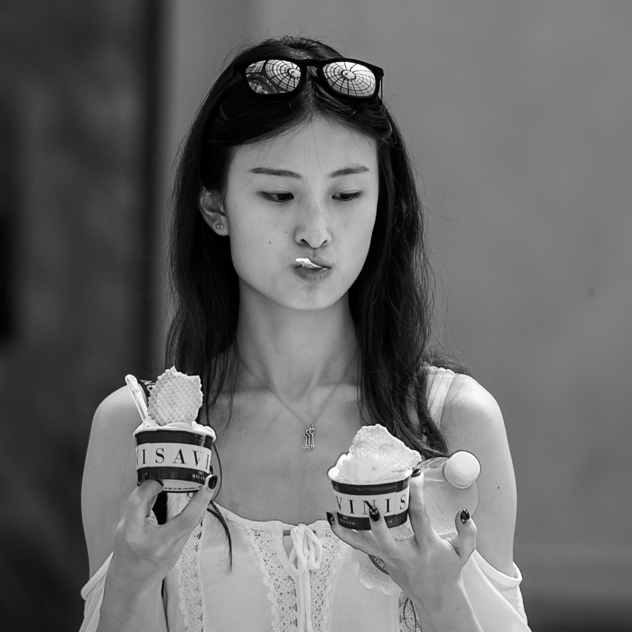 B/N da correggere. Ma non ci vuole tanto. A parte questo, è un'immagine che mi cattura. Iniziando dagli occhiali "dell'uomo ragno"; poi la palettina "golosa" in bocca e lo sguardo quasi a dire: "mò quale mi mangio?".