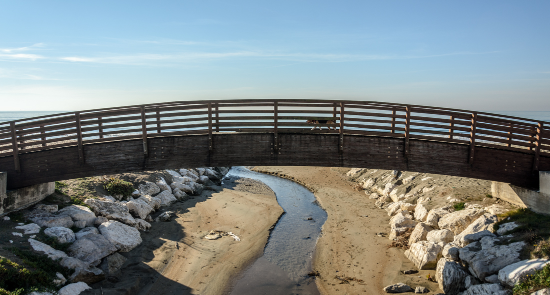 Immagine sulla quale lo sguardo si posa volentieri per esplorare il piccolo mondo attraversato da questo solitario cane.Belli e naturali i colori,interessante l'incrocio tra le due vie:il ponticello ed il piccolo corso d'acqua prossimo all'abbraccio con il mare.Complimenti! Ciao
