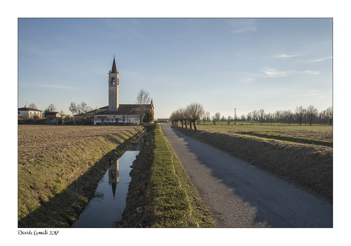 Bella composizione e ottimo il riflesso nel cavo irriguo del campanile.