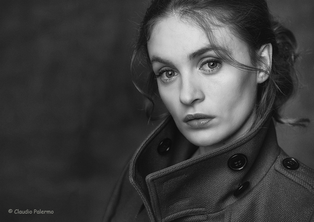 Una perplessità attenta nello sguardo che cattura , e un incarnato soffice ma senza cadere nella irrealtà. Sfondo moderatamente crespuscolare su toni di grigio più densi, ma senza appesantire, e tanto dettaglio anche sui particolari del cappotto e sulla lucidità dei bottoni. Una piccola quota di rumorosità, che a questi gradi è quasi un tocco di classe.