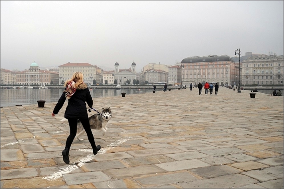 Vista già in altri lidi la tipa col cane apre la strada a questo panorama cittadino della bellissima Trieste. È vicino al museo del mare Sergio? Un saluto