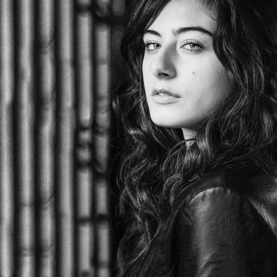 Un mix per me davvero riuscito fra le parti più soffici del soggetto e le note più marcate. L'ondulazione morbida dei capelli, l'incarnato latteo e la liquidità lucente dello sguardo, da una parte, e come contraltare invece la decisione nella scelta dell'abbigliamento con la matericità più incisa della pelle del giubbetto, e uno sfondo appena incerto, tanto da non rubare troppo la scena, ma geometrico e presente come ambientazione . Una ritratto particolarmente efficace.