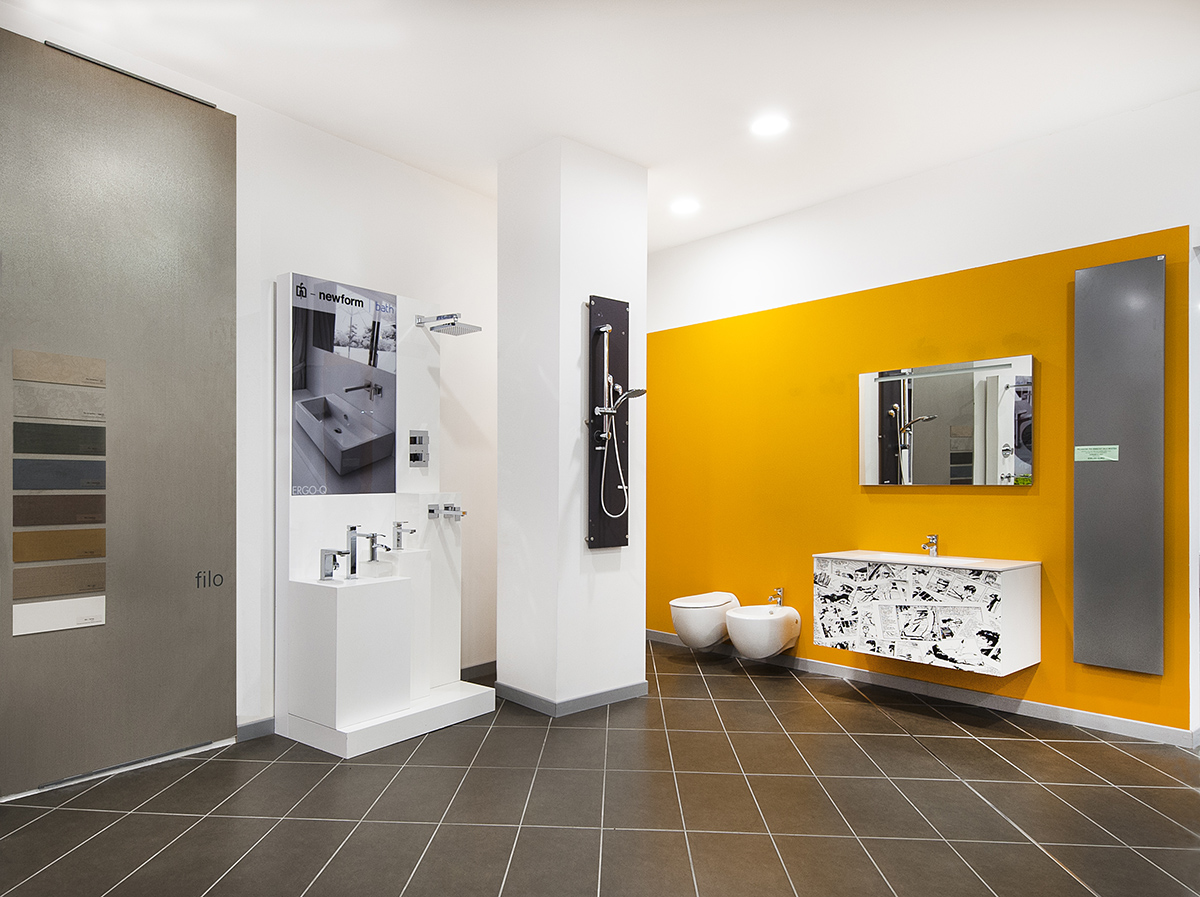 io eliminerei la striscia bianca a dx in modo da aumentare il senso di spazio percepito, se ti crucci per la fuga che tagliando se ne va clona il battiscopa e un poco di giallo . abbassa le luci sull'espositore a sx in modo che si noti maggiormente l'alternanza dei parallelepipedi...oppure sulla parete dietro