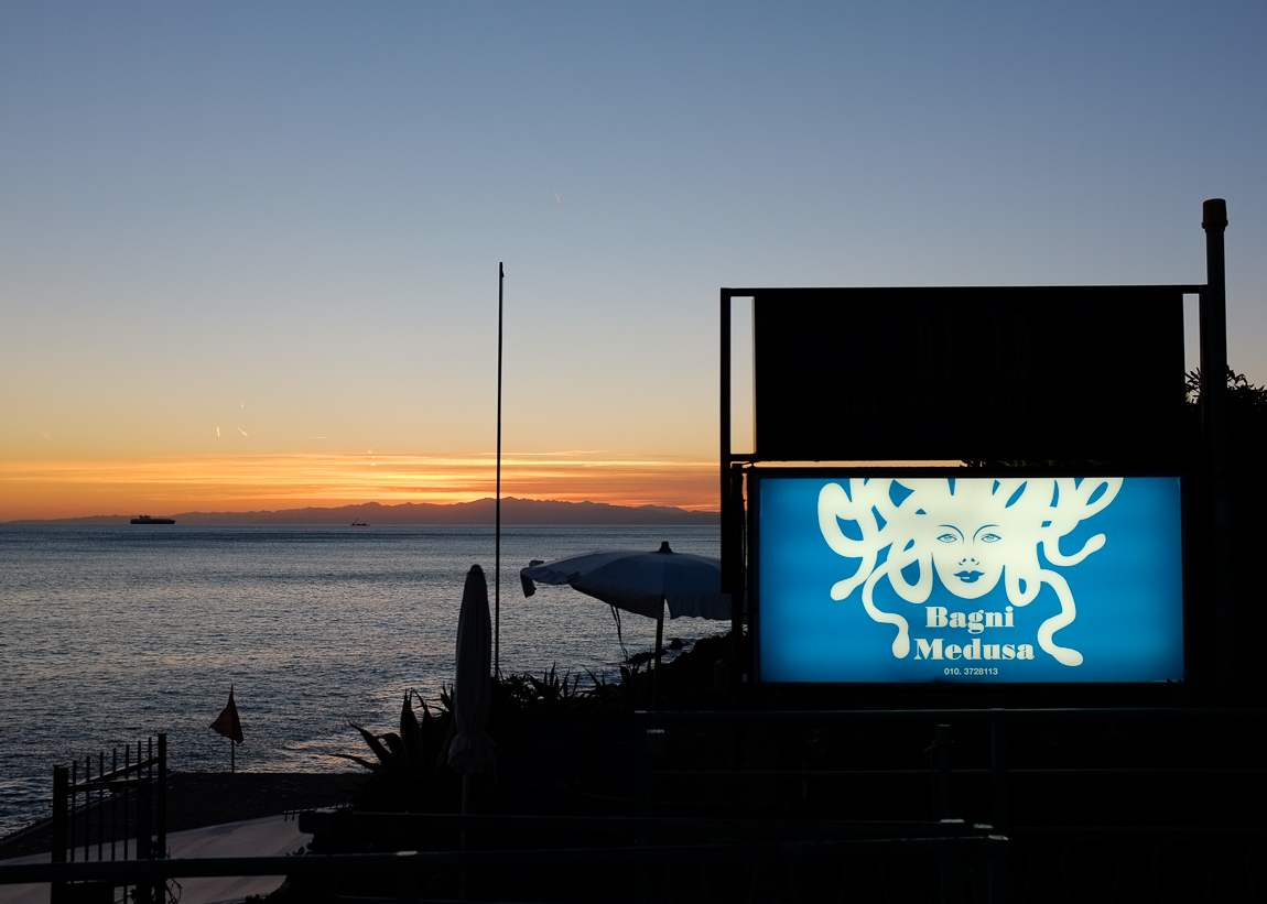 mi piace il silenzio del frame e il senso di intrigante mistero dei bagni Medusa, raccontati solo dalla invitante insegna