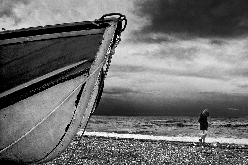 La barca in secca osserva e accompagna il viaggio della giovane donna, sola con i suoi pensieri, sotto questo cielo in tumulto.