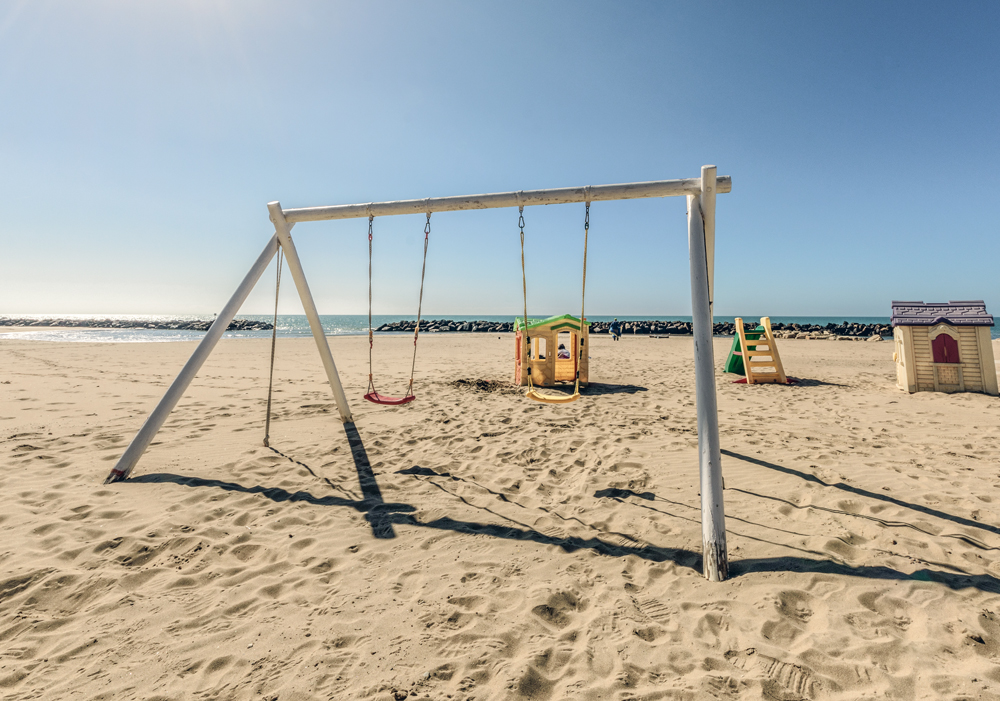 Par quasi che il seggiolino voglia invitare il castello di plastica ed il suo sgarbato abitante a librarsi nell'aria. Quello che parrebbe un disturbo un impallamento diventa un elemento narrante.