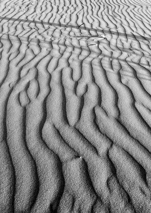 E' una bella descrizione del luogo,sapere dove è stata scattata è interessante,vedere linee tanto lontane che si somigliano..e dopo entra in gioco la visione personale.Di foto di dune e linee disegnate dal vento ce ne sono tremila è di piu'.Il primo piano,nella parte bassa mi sembra graficamente piu' convincente per il contrasto e quell'unico puntino,anche se caratterizzanti potrebbero sembrare i rametti sparsi piu' in alto con le ombre,che possono diventare disturbo nella grafica e nella semplicita' del disegno.Vedo una certa distanza fra le due zone ed i due disegni sulla sabbia.