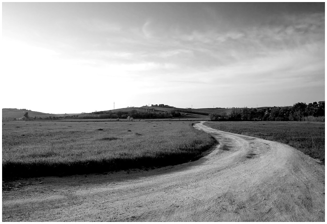 Una ampia curva è un accenno di "S" in formazione, data dal biancore della via sterrata.orizzonte centrale, conversione spenta, paesaggio scarno e piatto. Sembrerebbero ingredienti penalizzanti, eppure, attraverso la linea guida della via ricurva , si procede oltre il guado della statica ,e della rischiosa insignificanza. E c' é una certezza di luce all'orizzonte.