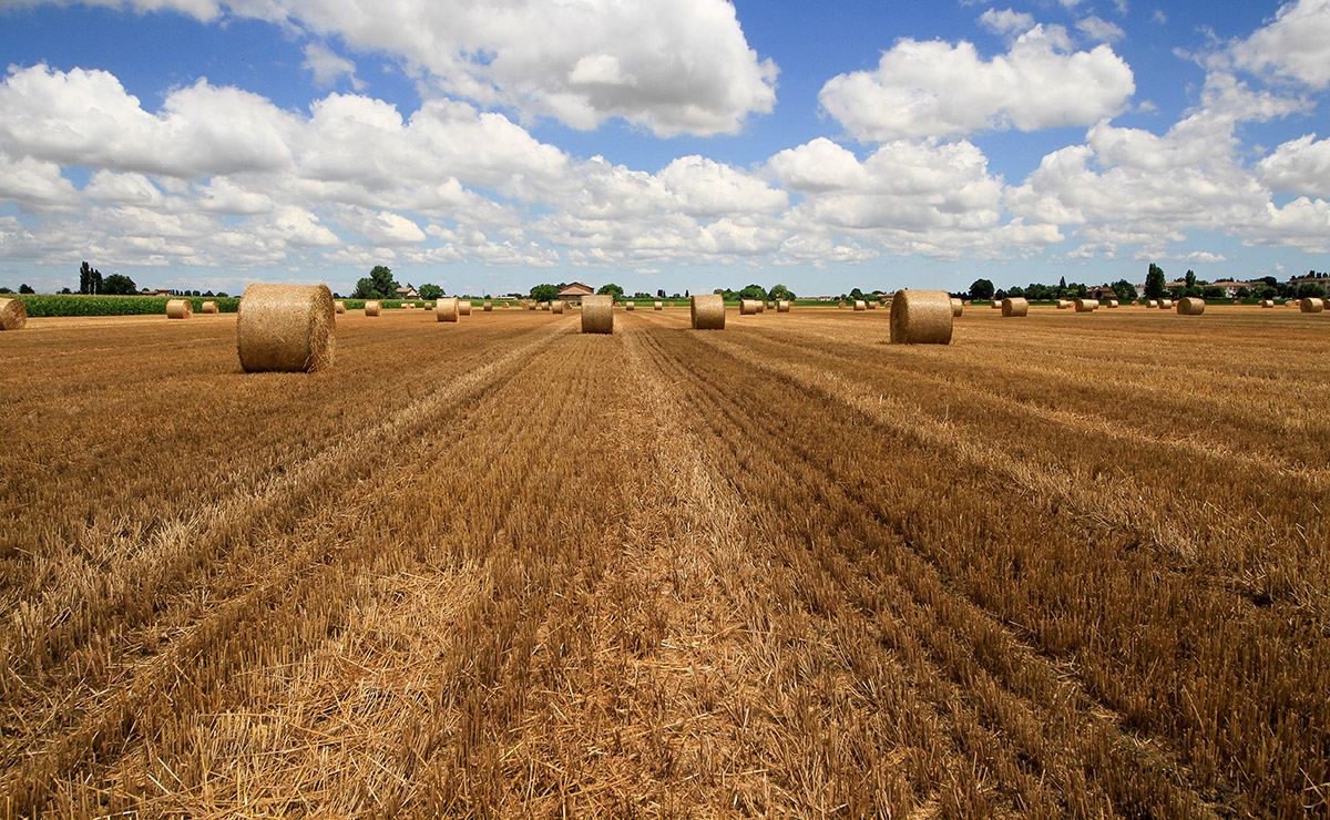 Bel classico, ripresa vasta ed ariosa e con una matericità ottima sulla terra coltivata. Rotoballe in formazione sparsa, ma ordinata, e un cielo generoso in nuvole e luce.