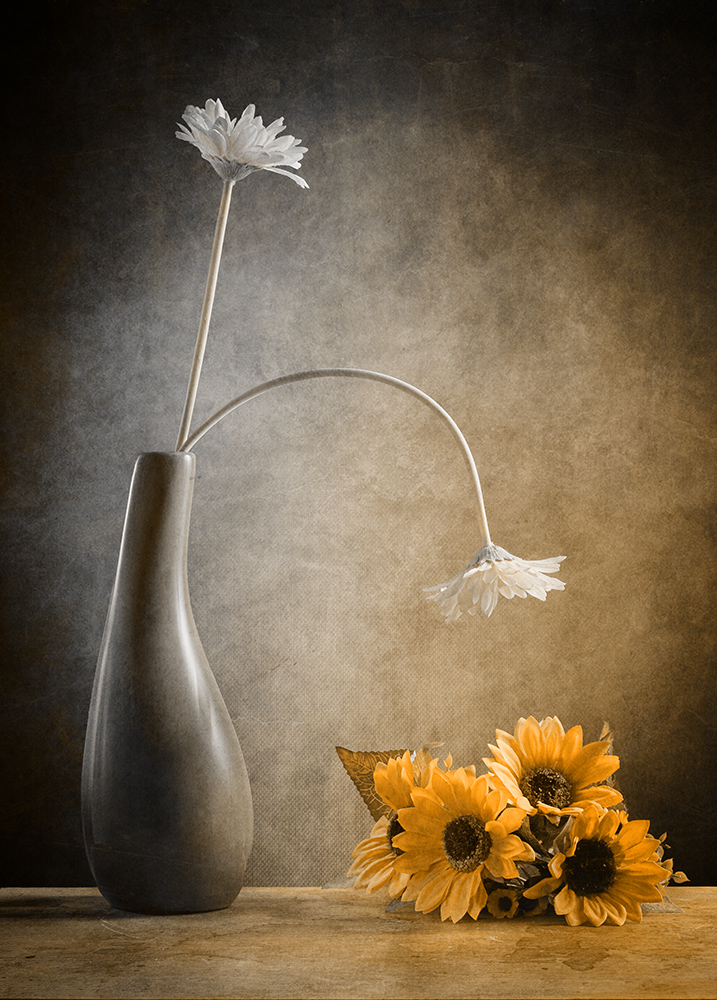 Azzeccata la scelta di dividere lo sfondo tra colori freddi a sx e caldi a dx, facendo conciliare la sfumatura di temperatura del fiore di sx che tende a scaldarsi sempre piu , fino al completo raggiungimento dei girasoli : il suo obiettivo .