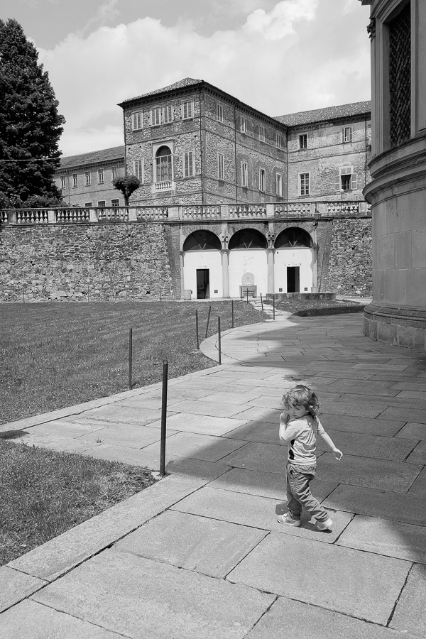 Il tuo angioletto biondo ad ingentilire la sequeza di curve, rettangoli, architetture. Grande profondità di percorso visivo fino alle tre arcate in bianco. Bianco e nero dai contrasti contenuti, che quasi si lascia intenzionalmente velare dal sole del giorno pieno.