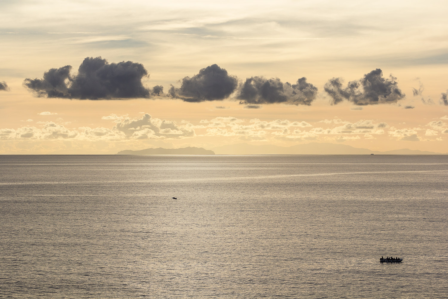 Le due quinte di nuvole, chiare e scure e quel promontorio od isola scandiscono i diversi piani del frame fino al netto controluce dell'imbarcazione solitaria.