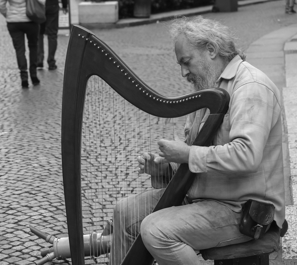 Ricorda abbastanza il grande Alan Stivell, arpista e musicista bretone del quale ti allego una foto (non mia).