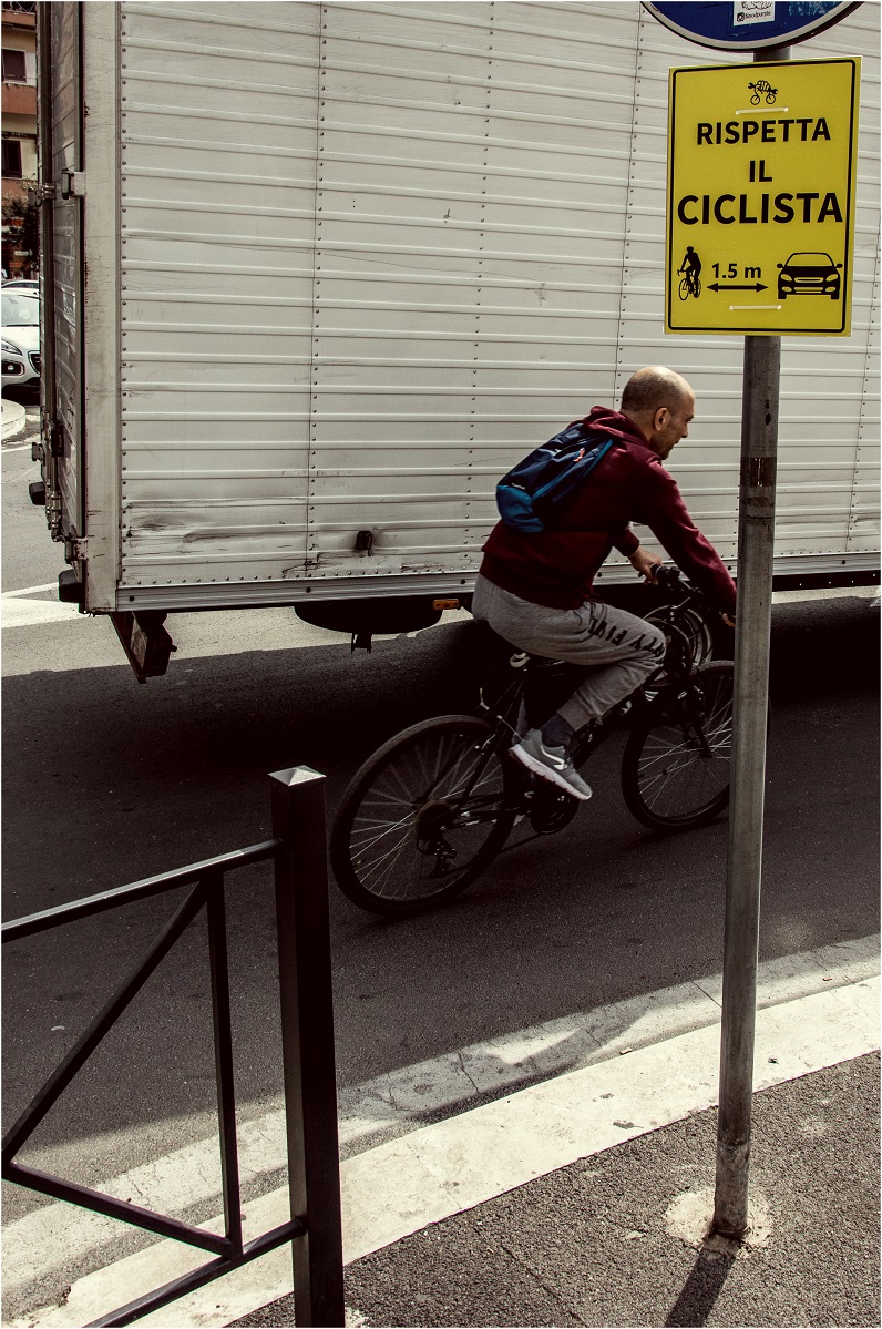 Quanti incidenti si sarebbero evitati osservando quella indicazione!Ma vedo il manubrio della bici a pochi centimetri dal camion!Ottimo tempismo per questa immagine che è anche una denuncia sul non rispetto delle regole della strada.  _________________ Sergio Demitri https://www.flickr.com/photos/124946035@N02/ |