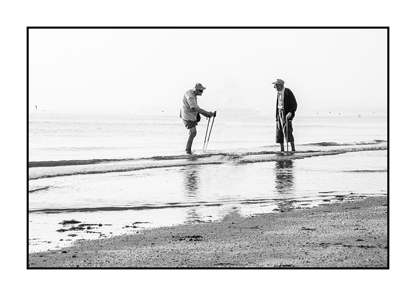 Chi lo Sa... forse i due si erano conosciuti una vita fa...su questa stessa riva, con i piedini a mollo per le prime volte, è un secchiello e una paletta colorata fra le mani. Ora rieccoli nell' acqua salmastra, vicini, l'aiuto di un bastone per sorreggere le bambe magre. A questo mi fa pensare ma tua foto, a come il paesaggio annulli in fondo anni di distanze, come se il tempo, per il mare , contrariamente al nostro, non passasse mai. Una lieve poesia visiva, che ci offre una grande verità, nella dolcezza di un elegante, lucente B/n.