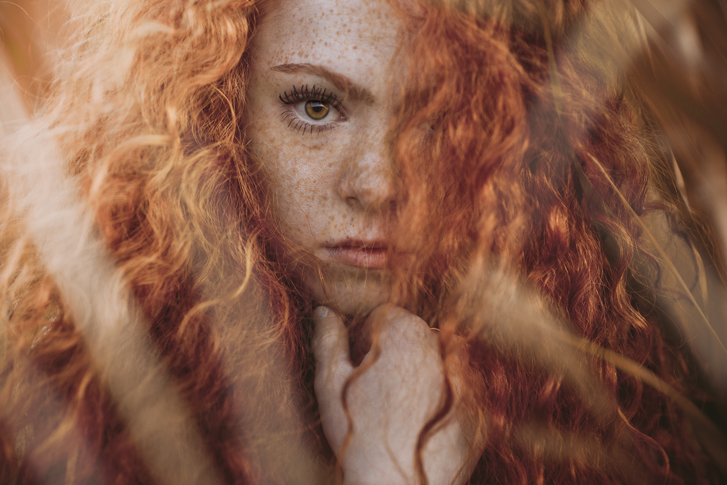 La chioma infuocata, il calore delle lentiggini, le labbra delicatamente in tono, e uno guardo attento: il trucco esalta la lunghezza ed il dettaglio della ciglia: tutto concorre a caratterizzare fortemente il volto, anche se paradossalmente ne scorgiamo solo una porzione, nel gioco delle sfumature nel campo. Il 2.2 ti permette di scegliere gli accenti visivi da porre in luce, e di includere una gabbia di steli nel campo, solo accennata, che isola il soggetto virtualmente da noi, lo protegge quasi, ma ne permette integro tutto l'impatto.