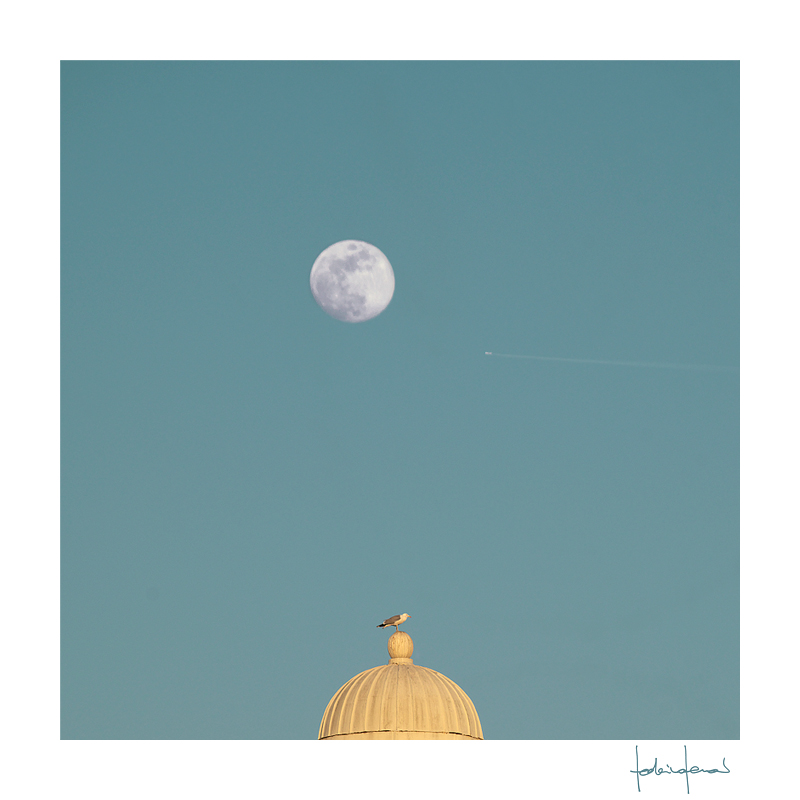 La Luna trasgredisce dalla centralità solo per un nulla.E sembra farlo per allontanarsi dalla traiettoria sottile dell'aereo in avvicinamento. Bellissima la luce dorata sulla cupola e la delicatezza dell'azzurro . Il piccolo abitante alato troneggia tranquillo al vertice, come un piccolo gigante, mettendosi in competizione con la luna per la nostra attenzione.