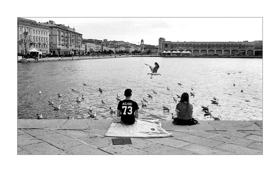 Delicatissima immagine con la distanza tra i ragazzi riempita dal volo del gabbiano/Cupido. Sempre complimenti
