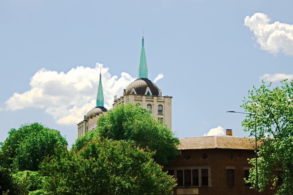 vedo dei verdi irreali, tanto sul fogliame quanto sulla copertura di bronzo delle guglie, che in realtà è di un verde tenue e delicato, poco più che un verde acqua sbiadito.