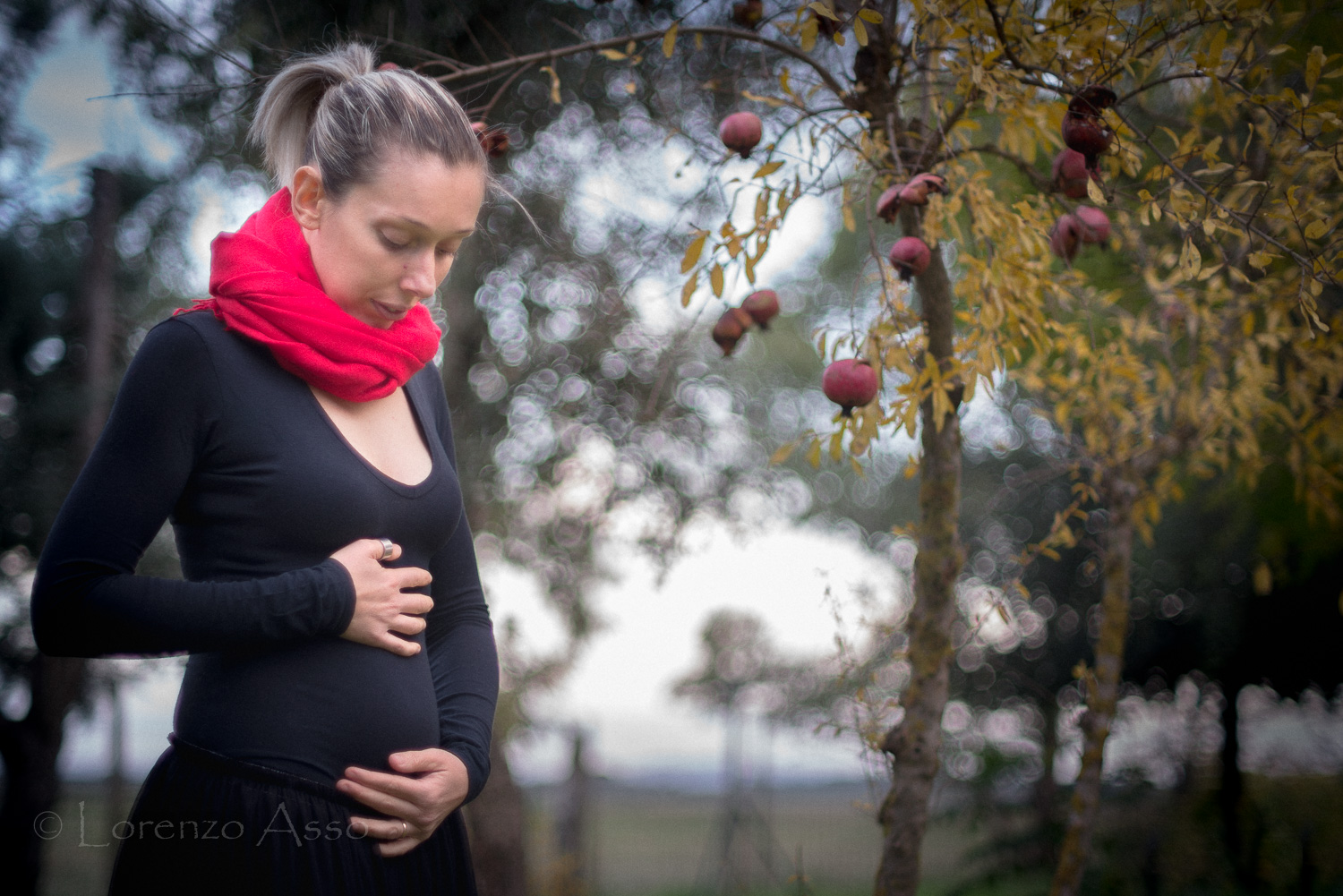 Una attesa tenera , palpitante e colorata. Il gesto di lei é di intimità assoluta : lieve ma significativo. Si raccoglie in se , ma senza escludere, e comunica una felicità serena ,nella attesa. Molto efficace il punto di colore intenso della sciarpa , e il silenzioso richiamo concettuale ,fra i frutti sui rami ,e la curva del ventre che accoglie una nuova vita. Un ritratto Lorenzo che metto fra i preferiti con grande piacere..