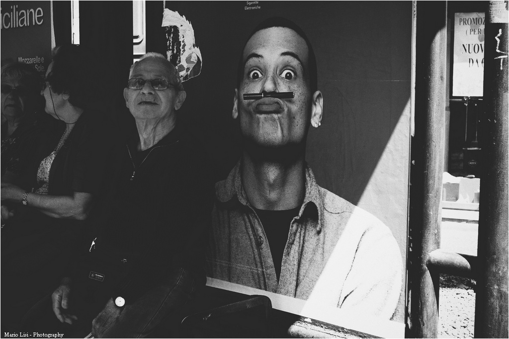Ma qui si sorride anche perchè il signore, reale, occhialuto, magari non pensa al volto alle sue spalle, e crede che ogni interesse dell'obiettivo sia rivolto a se'