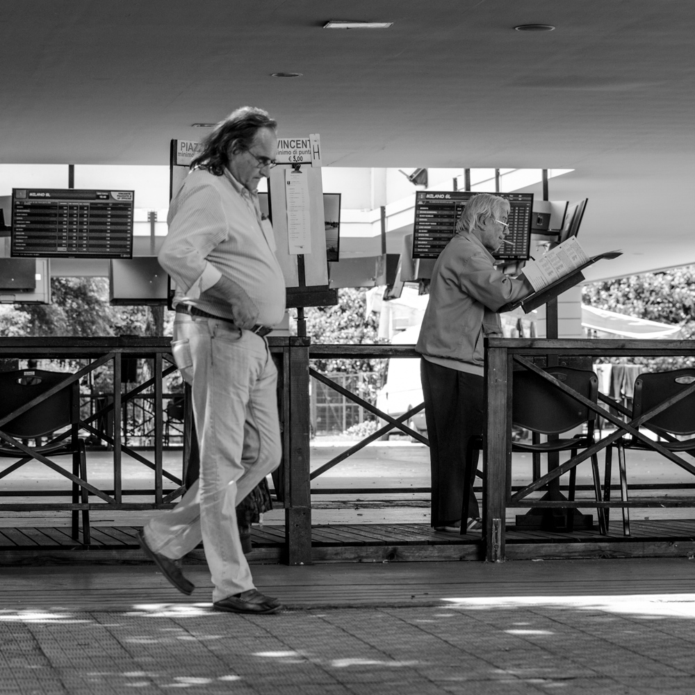 Il tipo con la sigaretta, in realtà raccoglie le scommesse, e sta studiando a quali quote proporre i cavalli che partecipano alla prima gara. A Milano si chiamano "picchettari".