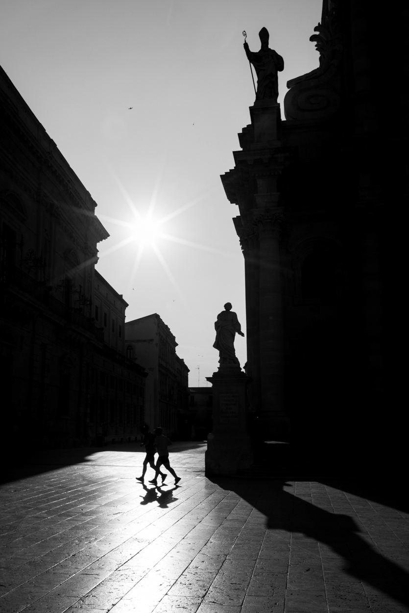La foto mi piace per la silhouettatura totale, per il dialogo tra i runners e la statua e per lo spazio vuoto della piazza, che rende sempre un' idea marziale.