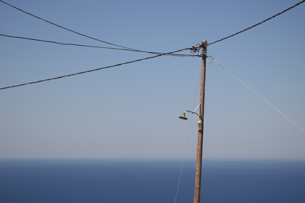 se si allenta uno solo di questi cavi credo crolli anche il palo. La struttura cavi e palo in equilibrio precario si contrappongono alla maestosa bellezza di questo mare azzurro ed il tutto sembra aggrapparsi agli angoli del frame per sostenersi.