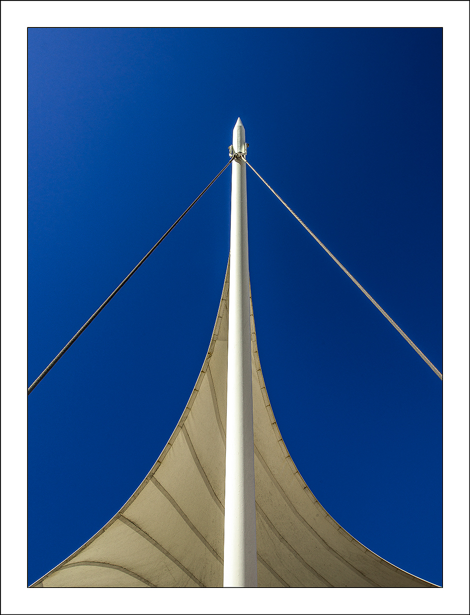 Composizione ancor più essenziale nella ricerca delle forme. Un palo svettante 'poggiato' su di un triangolo fino a compenetrare in esso fondendosi insieme, una freccia incuneata nel blu perfetto e la tensione enfatizzata da tiranti in diagonale che conducono lo sguardo alla punta. Tre come parrebbe la suddivisione del frame in tre parti, ma a ben vedere solo due parti speculari con l'asta nel mezzo. Ottima la giustificazione degli angoli che qualcuno mi ha insegnato debbano sempre essere congruenti nella loro terminazione da entrambi i lati ,qui nel bordo esterno della tela ...quasi una luce che scivola via.proposta luminosa, armonica da cui imparare a comporre e vedere...