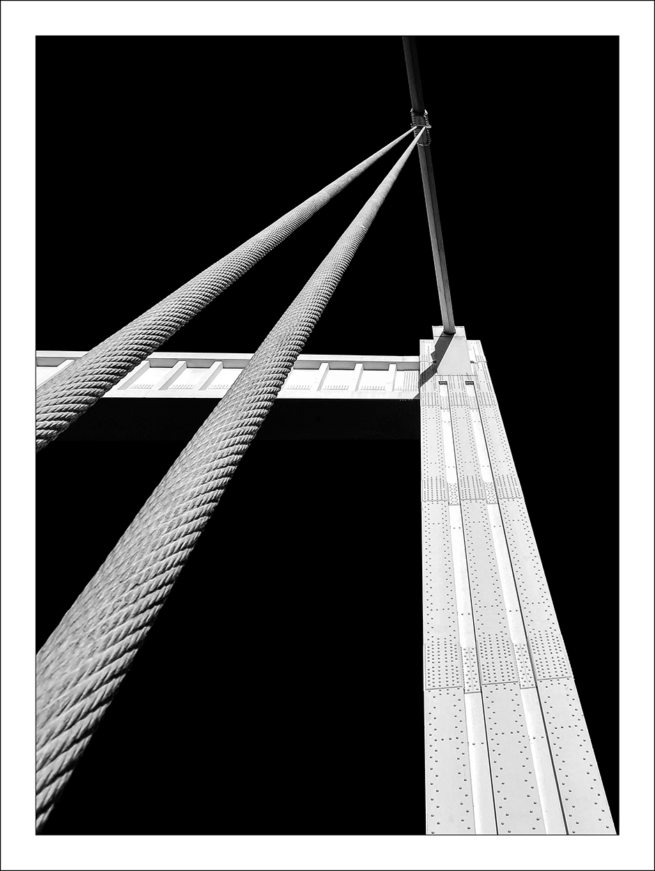 grazie all'efficacia della composizione, una foto che porta lo sguardo immediatamente a correre sulle funi verso l'alto e a ricadere seguendo la struttura metallica verso il basso...davvero ottima con un B&W efficacissimo.