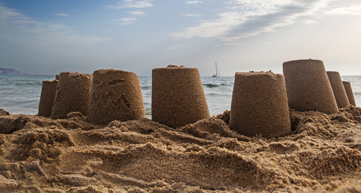 Minuscoli bastioni di sabbia: castelli mignon, che nella tua ripresa divengono giganti. Al largo solo un solitario veliero fra le onde. Davvero bella.
