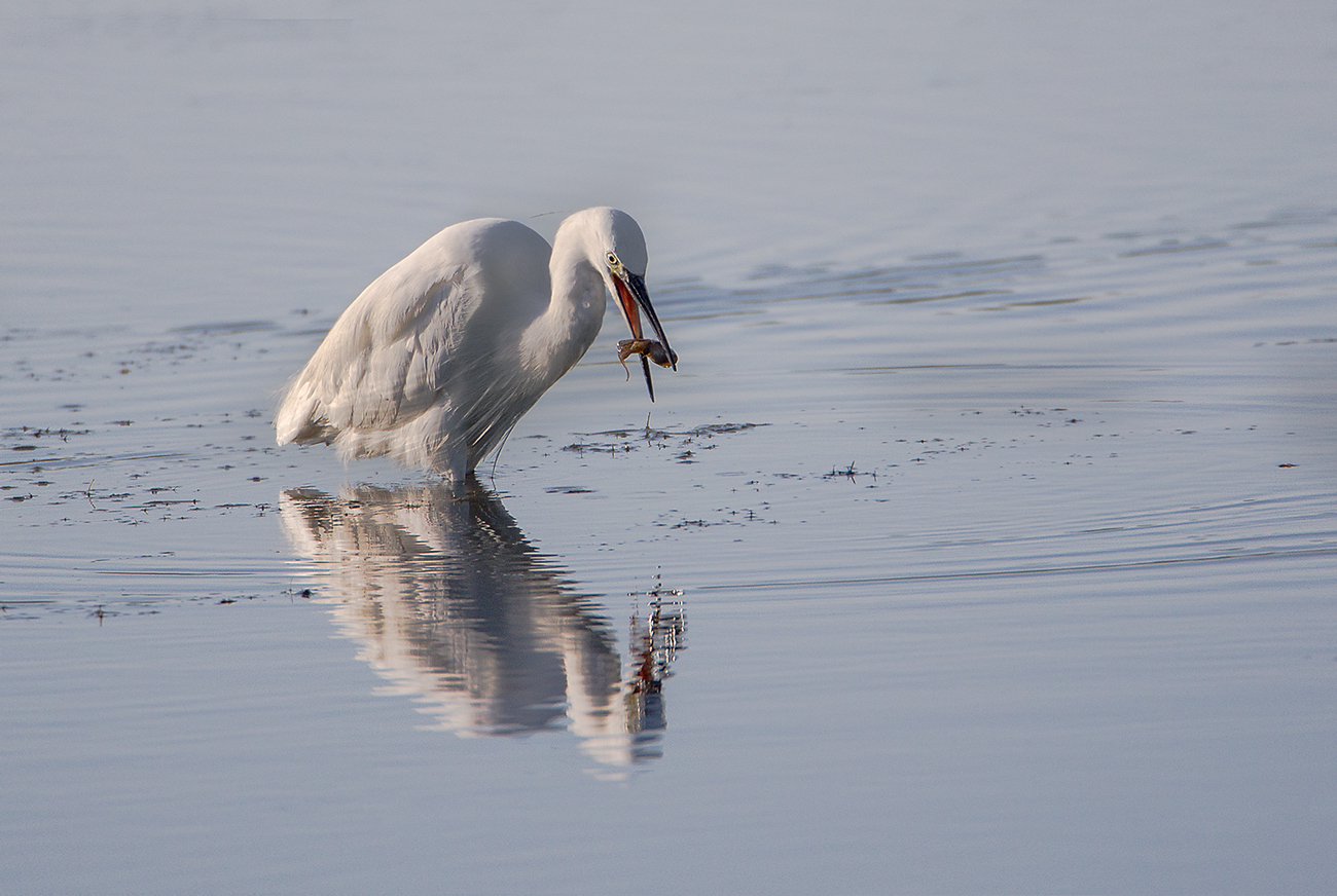 immagine molto bella. Garzetta in predazione con il suo riflesso.