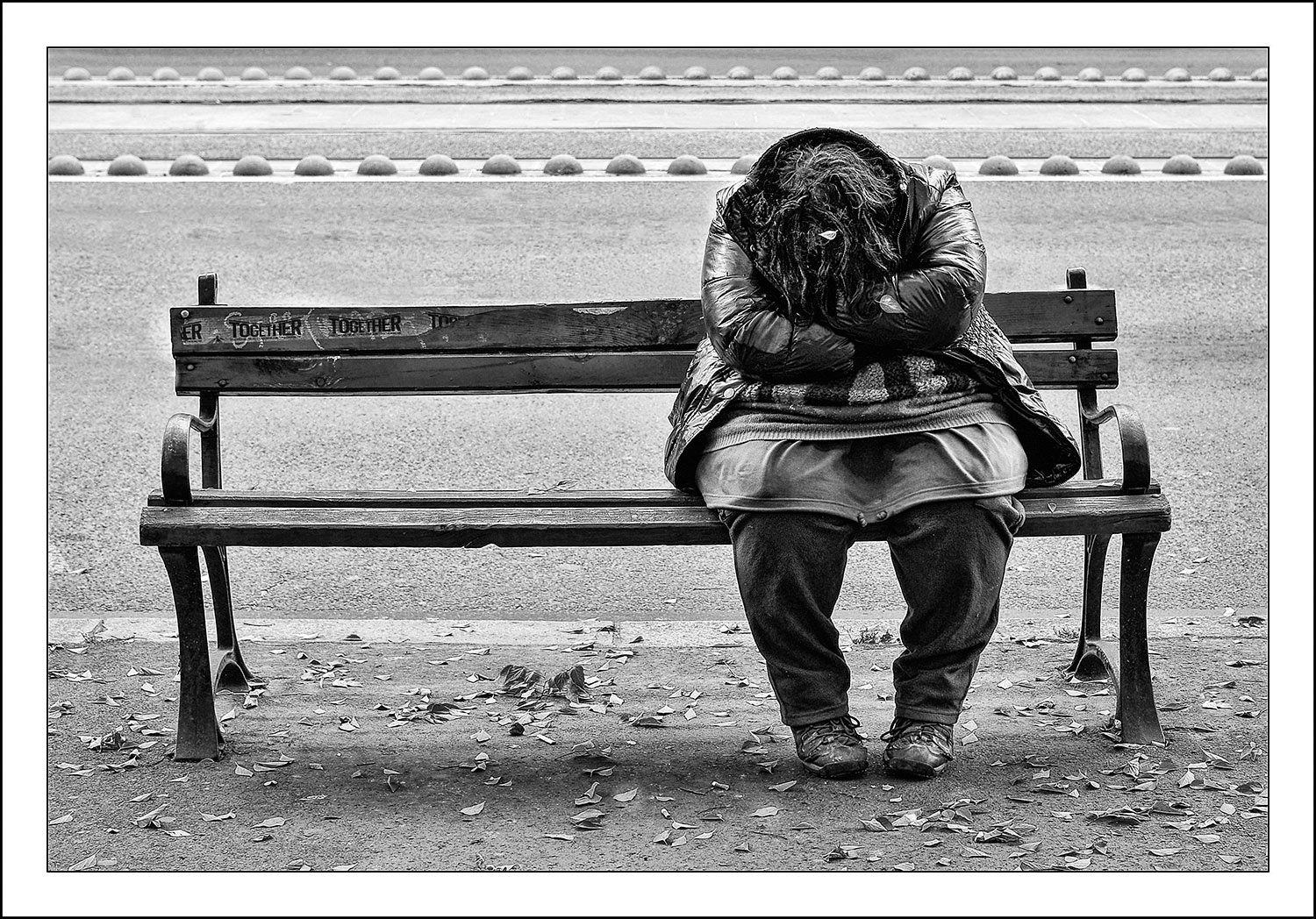 Fotografa una condizione, con tratti vitrei ed incisi, e se genera disagio che si fa pietas, in questo viluppo dettagliato di carne e tessuto, dimenticato in se stesso, sul ferro di una panchina, davvero colpisce nel segno.