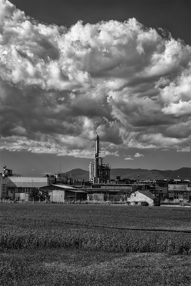 Una bella foto, particolare e non poco la nube che avvolge il complesso industriale,