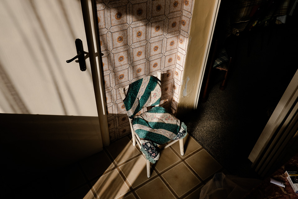 Triangoli d'ombre, verticali di luce, linee geometriche convergenti alla sedia cuscinata ( si può dire? eheh) di verde. Un oggetto di arredo dimesso, ma forte come un centro di attrazione magnetico , per forze luminose e tragitti invisibili di energia.. domestica!