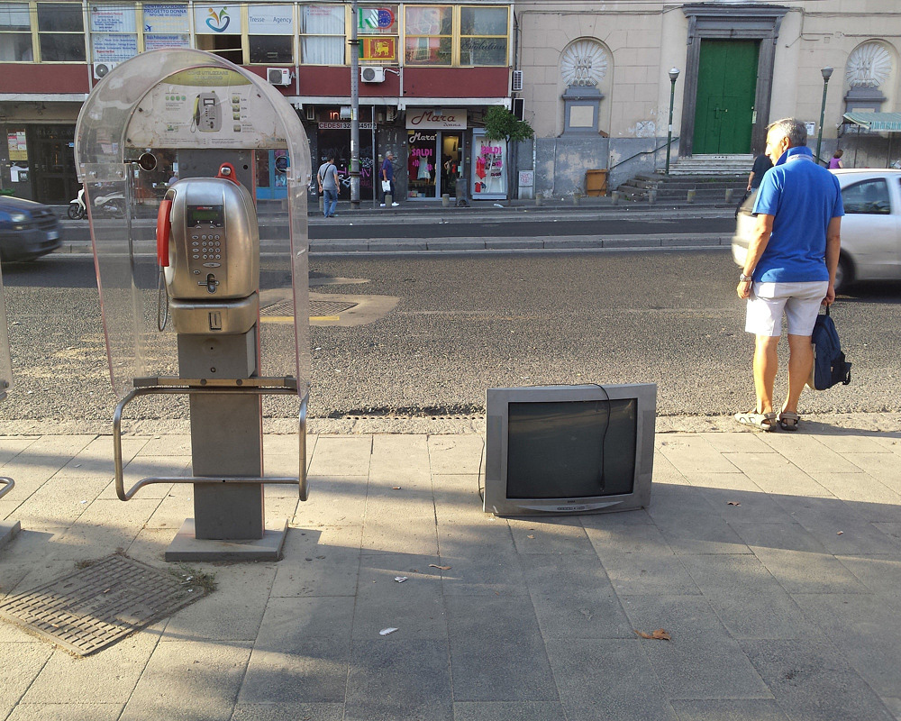 Personalmente avrei messo in risalto solo la torretta telefonica e la tv. Senza presenta umana...Per enfatizzare, più che il degrado, il surrealismo un po' "vintage".