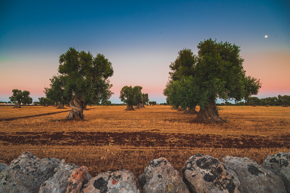 Un plauso particolare alla composizione, con un susseguirsi ordinato e gradevole di colori , ed elementi: un muretto di sassi alla base, e poi il giallo del campo, le zolle qua e là visibili, i grandi tronchi torti nella corteccia a sostenere le ampie chiome . Mettiamoci poi il rosa azzurro del cielo e la piccola luna... e il romanticismo si fa strada. Forse qualche piccola concessione alla saturazione delle tinte poteva essere smorzata, e una gradualità di passaggio dall'azzurro al rosa nel cielo poteva migliorare.