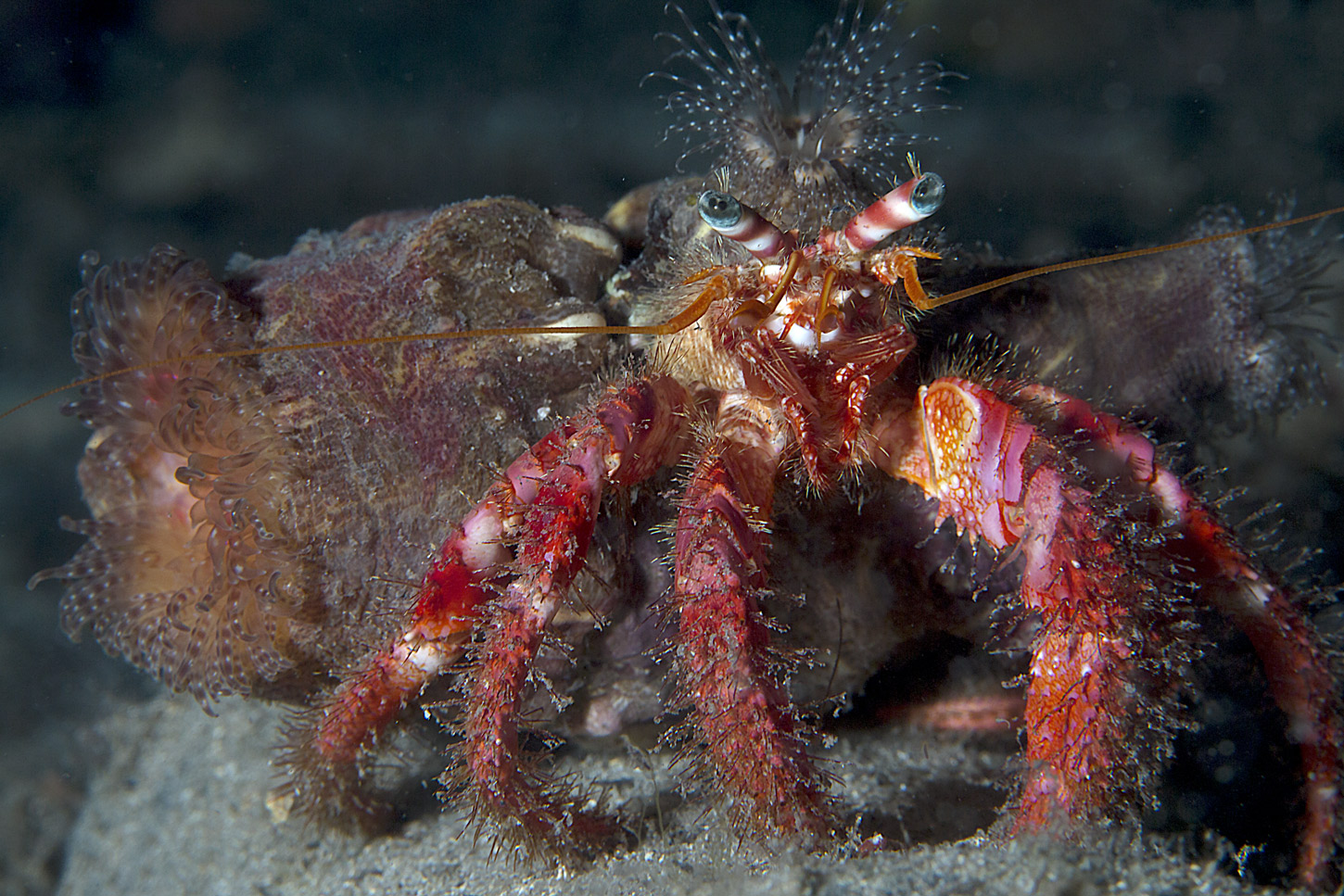 Un paguro che sfoggia un ricco corredo di anemoni.