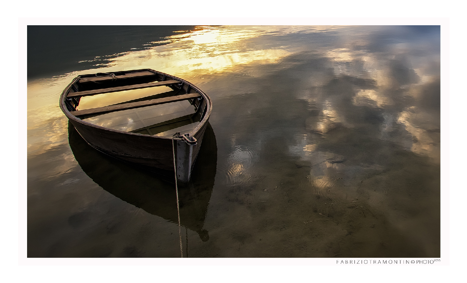 La piccola lancia oramai più che galleggiare penso posi sul fondo!Immagine molto suggestiva che trasmette un senso di serenità e calma.Bellissima la luce che continua a riflettersi anche all'interno della barca,ottimi i colori.