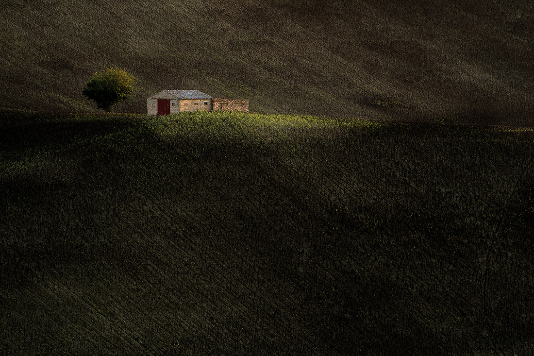 Dolce e graffiante al medesimo tempo, con una compo in un certo senso estrema, ma efficace, mirata, che puntualizza visivamente la luce dorata , ma fioca, che centra solo il casolare, il miuretto isolato, la chioma verde, e li difende dalla crepuscolarità ruvida del circondario di terra bruna.