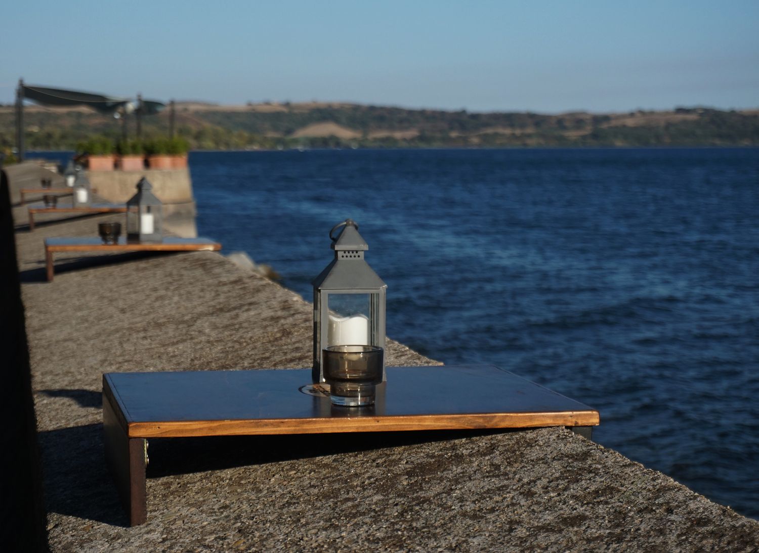 | Buona l'idea di questa infilata di tavolini con lanternino e candela. Immagino l'ora dorata della sera o ai primi raggi del mattino.