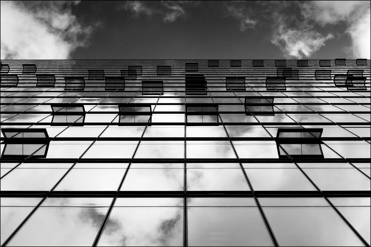 Fantastico il riflettersi della nuvole nei vetri, e un senso di azzurrità, restituita da una ripresa priva di colore....