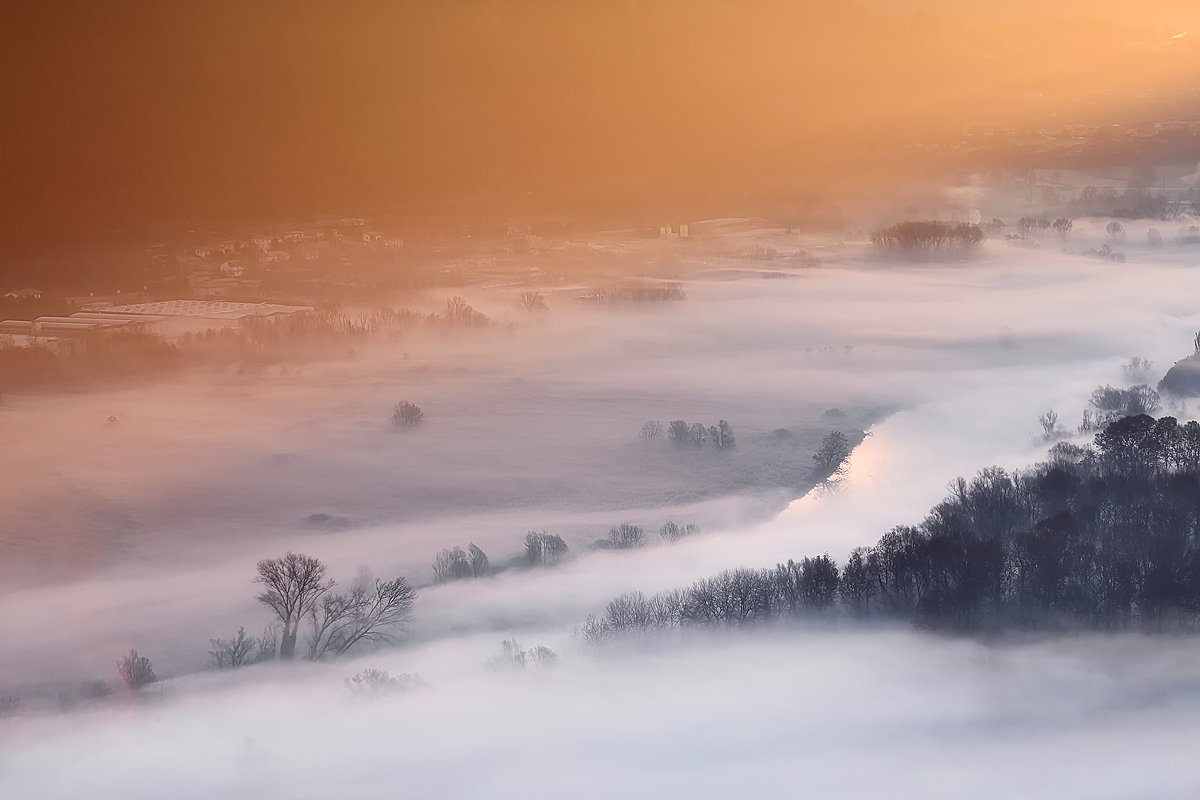E così il primo raggio di sole inonda la sponda orientale dell'Adda, all'altezza di Airuno, mentre il fiume, ancora addormentato per alcuni minuti rimane avvolto, quasi intrappolato nei toni freddi. Uno spettacolo che dura un attimo....