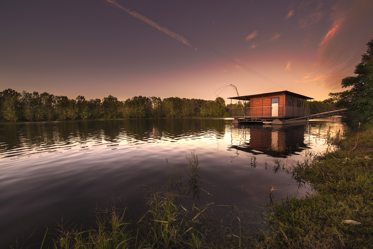 Trovo questa proposta molto accattivante. Gioca tutto sulla forza delle luci, sulla densità dei chiaroscuri e sulla lucentezza assicurata da questa ampia superficie liquida e riflettente. La personalizzazione in post c'è, però non sconfina nella resa innaturale, semplicemente esalta il calore dei toni dove presente, e asseconda la chiarezza residua di luce diurna che corre lungo una linea ideale ma invisibile fin verso il capanno e il suo fondale di appoggio. Tutto si fa pittorico, ma senza l'uso del pennello e della tinta ad olio...