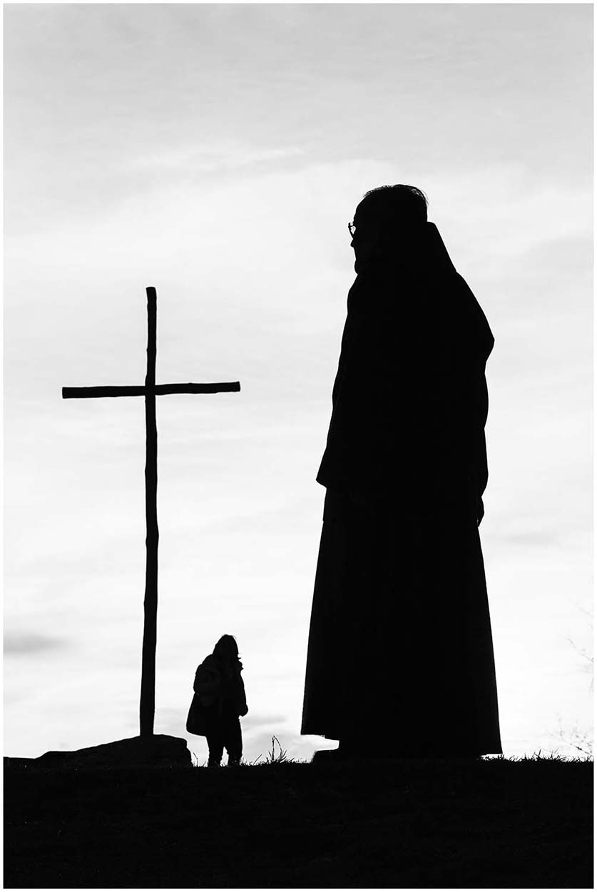 Una foto molto molto suggestiva ed evocativa, ottimamente ripresa e di grande forza narrante supportata dalla conversione in BN decisa che ben si addice al raccontare. Masse scure che ben si stagliano contro il cielo chiaro ma non piatto e su tutto il simbolo della croce che, nel suo nero riluce.