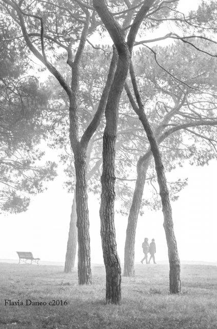 | Ciao Flavia, tempismo nello scatto e hai colto le due figure nel punto migliore e, se la vista non mi inganna, avanzano con lo stesso passo.Avendo meno aria davanti direi che il titolo è più che azzeccato, escono di scena per tornare in primavera e la panchina vuota ne è la conferma. L'ottimo pdr ti ha permesso di non sovrapporre il maggior numero di alberi.Bella la conversione in b/n morbida ,quasi evanescente.Complimenti |