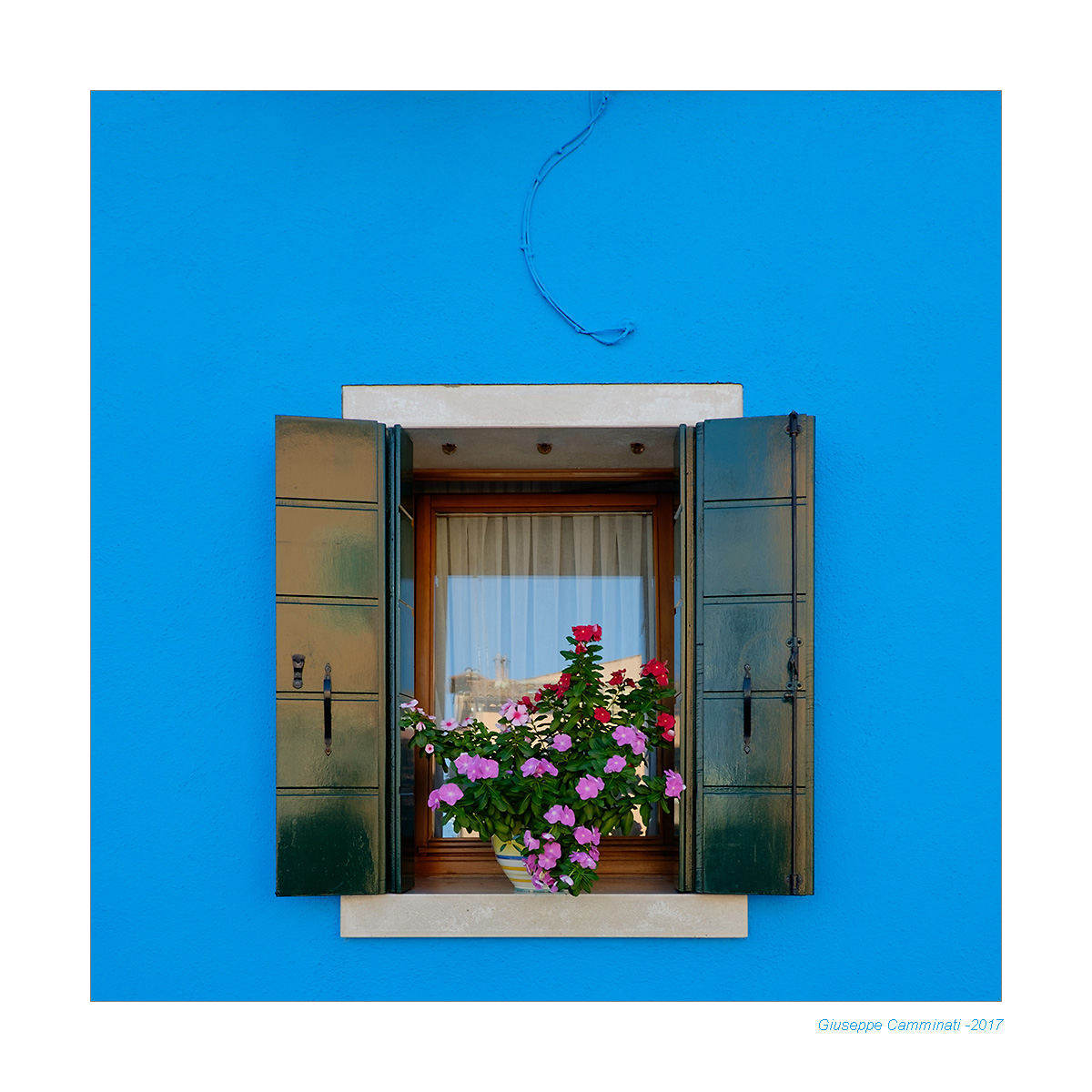 delicati fiorellini alla finestrella che si apre su un "cielo" azzurrissimo. Sempre deliziosa Burano