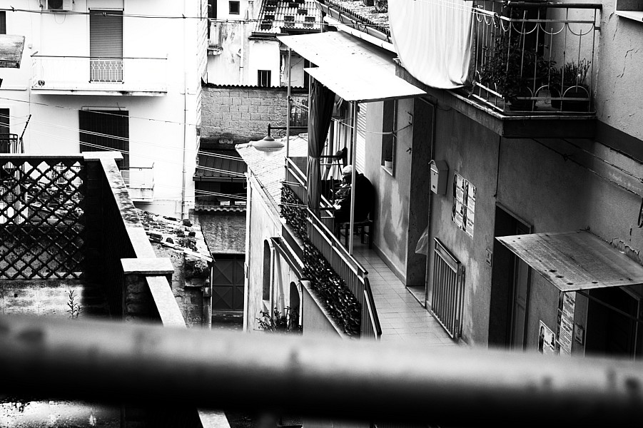 La scena per come è stata ripresa restituisce bene l'isolamento di quella singola persona nel dedalo di case e tetti e anche la sbarra in primo piano, benchè ingombrante, rende il fotografo protagonista della storia.